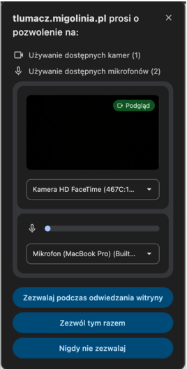 5. Po kliknięciu na „zezwalaj podczas odwiedzania witryny” pojawi się komunikat „Łączę z Tłumaczem PJM”.